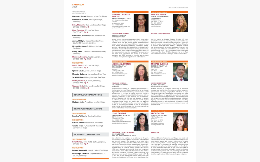 Being named to the San Diego Super Lawyers list reflects Sally’s continued dedication to excellence in tax law, her strategic advocacy on behalf of clients, and her commitment to delivering thoughtful, results-driven representation in complex tax matters.
